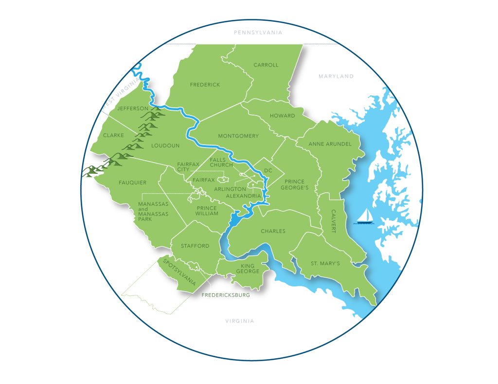 Our Travel Survey region covers a wide geographic area stretching from the Chesapeake Bay in the east, to the Blue Ridge Mountains in the west and from Southern Maryland and the Fredericksburg, VA area in the south and to the Pennsylvania border in the north. The District of Columbia, along with many other local jurisdictions and communities in Maryland, Virginia, and West Virginia, shown on the map to the right, are all included in this Travel Survey Region.